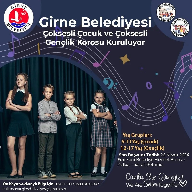 Girne Belediyesi, çocuk ve gençlik korosu kuruyor. Belediyeden verilen bilgiye göre, Çoksesli Çocuk Korosu’na 9-11 yaş grubu çocuklar, Çoksesli Gençlik…